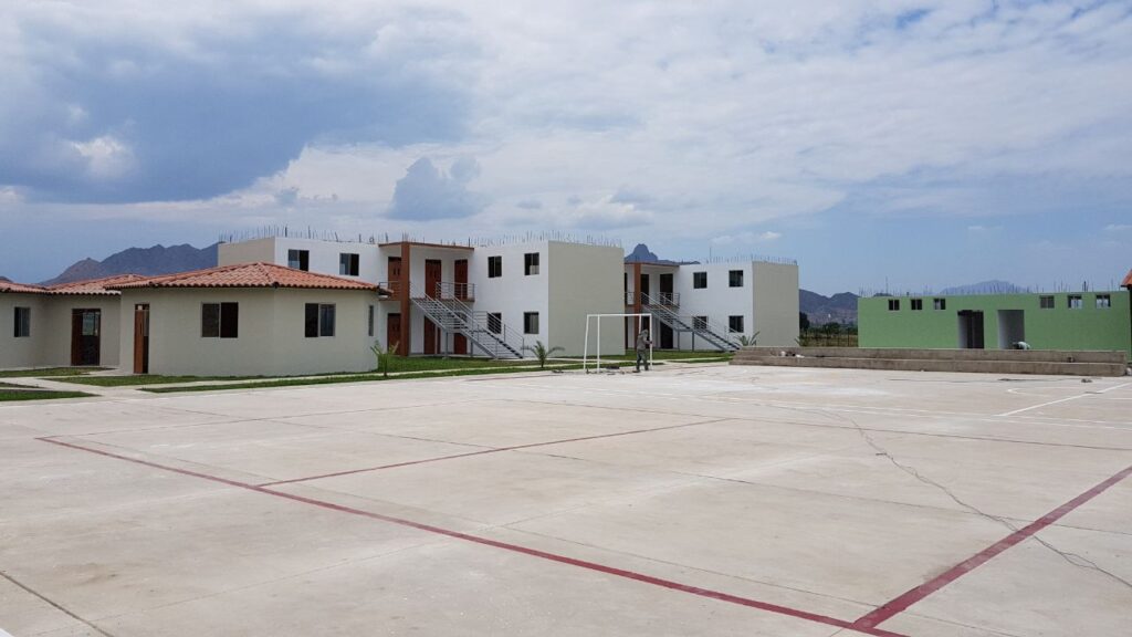 Esta obra cuenta con un área de administración ,05 módulos tipo planta octogonal para el nivel inicial, un pabellón de dos niveles que albergan a 06 aulas de nivel primario, un pabellón de 02 niveles que albergan las aulas de nivel secundario más talleres, un Salón de usos múltiples con estructura metálica y cobertura de teja andina a espacio abierto,02 plataformas deportivas, una capilla de estructura metálica a espacio abierto, un campo de césped natural para actividades deportivas, su acceso va a dar a un gran espacio receptivo donde también se ubica la playa de estacionamiento y bordea una circulación principal que cruza todo el planteamiento la misma que nos lleva a todos los ambientes del proyecto.